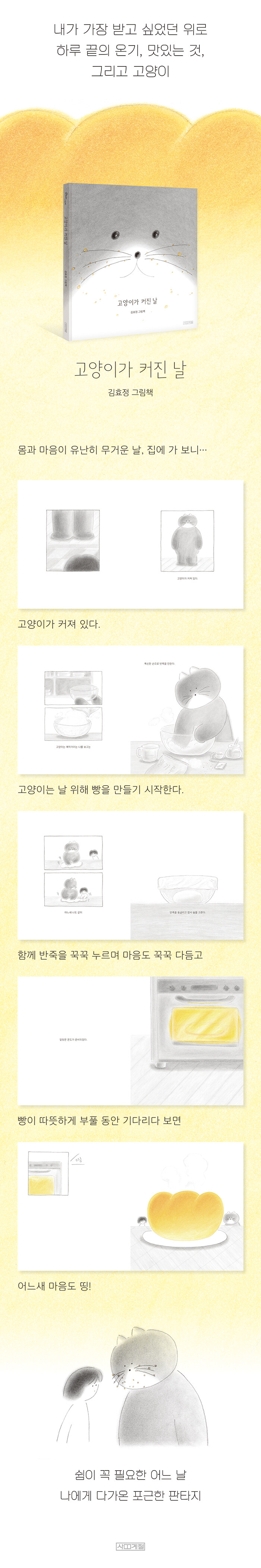 하루 끝의 온기, 맛있는 것, 그리고 고양이몸과 마음이 지친 어느 날, 터덜터덜 집에 왔더니 우리 집 고양이가 커져 있다. 고양이는 ‘나’를 돌보는 집사라도 된 듯 날 챙기고 따뜻한 저녁상을 차린다. 나는 찬이 많은 밥상이 영 당기지 않는다. 그러자 고양이는 빵을 만들기 시작한다. 함께 고운 반죽을 꾹꾹 누르고, 예쁘게 둥글리고, 시간을 갖고 기다린다. 따뜻하게 부풀 때까지.
