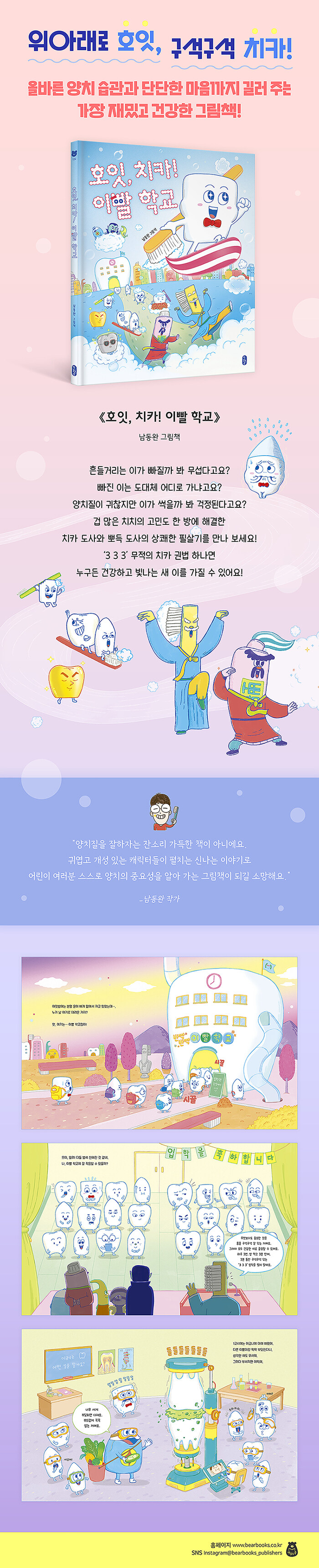 남동완 작가는 두 아이를 키우며 세상에서 제일 귀찮고 지겨운 숙제인 양치가 조금이라도 즐거운 놀이가 되길 바라는 아빠의 마음으로 이 이야기를 만들었다고 합니다. 그래서인지 책장을 한 장 한 장 넘길 때마다 곳곳에서 열심히 궁리한 흔적들이 보입니다. 학교 건물은 튼튼한 어금니 모양이고 선생님은 모두 양치 도구에서 착안한 캐릭터들입니다. 겁 많고 소심한 주인공 치치가 학교에 적응해 가고 급기야 위기에 처한 친구들을 구해내는 모습은 유치원이나 초등학교 입학을 앞둔 어린이들에게 커다란 격려가 되어 줍니다. 또한 다른 이들보다 느리게 자라는 사랑니 교실에서는 저마의 속도와 다름을 존중하는 따뜻한 시선도 느껴집니다.