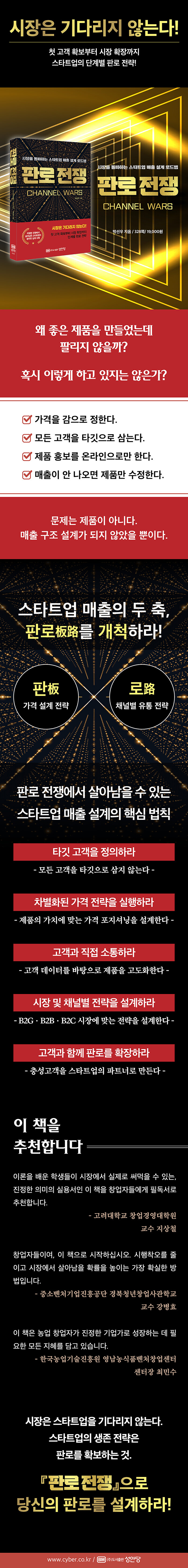 많은 스타트업이 제품 개발과 기술 고도화에 몰두하지만, 정작 가격은 감으로 정하고 유통은 막연히 온라인 광고부터 집행한다. 막상 기대한 매출이 나오지 않으면 문제점을 제품에서만 찾고, 이런 악순환은 계속 반복된다. 그러나 제품의 매출이 결정되는 순간은 대부분 판매와 유통 단계이다. 제품과 스타트업의 성패는 경쟁자로 가득한 이 판로 전쟁에서 살아남기 위해 전략을 얼마나 정교하게 설계했는가에 달려 있다.