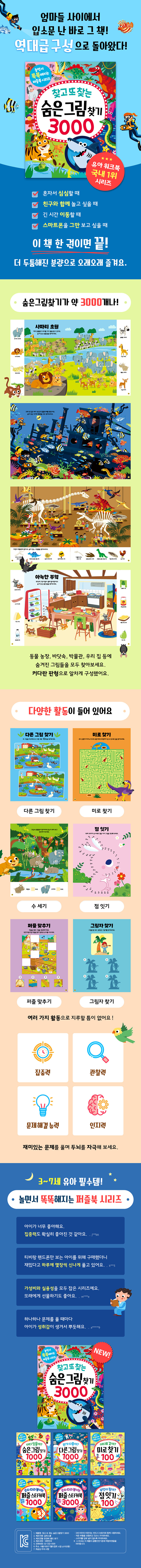다양하고 재밌는 활동이 가득한 점보판으로 오래오래 즐겨요!얇은 숨은그림찾기 책은 금방 끝나서 시시하다고요? 오래오래 갖고 놀 수 있는 놀이책을 찾고 있다고요? 지금 바로 『찾고 또 찾는 숨은그림찾기 3000』을 만나 보세요. 차원이 다른 두툼한 분량에 숨은그림찾기가 가득 들어 있어요. 동물 농장, 우주 공간, 바닷속, 공룡 시대 등 아이들이 좋아하는 그림 속에 숨어 있는 그림을 찾다 보면 집중력과 관찰력뿐만 아니라 창의력, 상상력, 문제 해결 능력까지 쑥쑥 자라요. 또한 책 속에는 숨은그림찾기 외에도 다른 그림 찾기, 미로 찾기, 점 잇기 등 정말 다양한 활동이 들어 있어서 시간 가는 줄 모르고 풀 수 있어요. 집에서 심심할 때, 긴 시간 동안 이동할 때, 아이가 스마트폰 영상만 보려고 할 때면 언제든지 이 책을 꺼내 보세요!