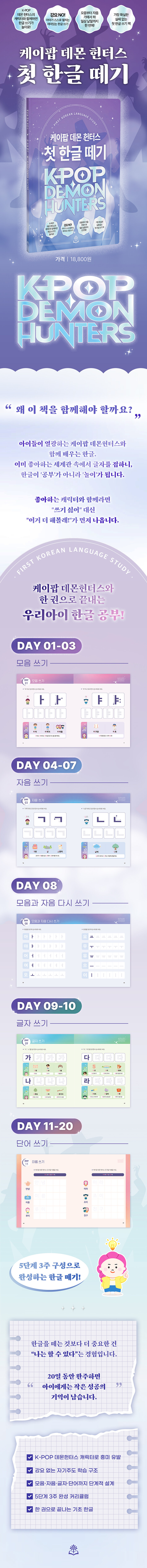 4. 강요하지 마세요. 아이가 먼저 시작하는 실패 없는 첫 한글 쓰기한글 쓰기는 시작이 가장 중요합니다. 아이가 쓰고 싶어 하지 않으면 어떤 학습도 지속되기 어렵습니다. 《케이팝 데몬 헌터스 첫 한글 떼기》는 학습을 강요하지 않고, 흥미를 통해 자발적 쓰기를 유도하도록 설계되었습니다. 재미로 시작해 기초 실력까지 자연스럽게 이어지는 구성으로 첫 한글 쓰기에서 시행착오를 줄이고 성공 경험을 쌓도록 돕는 실패 없는 입문서입니다.