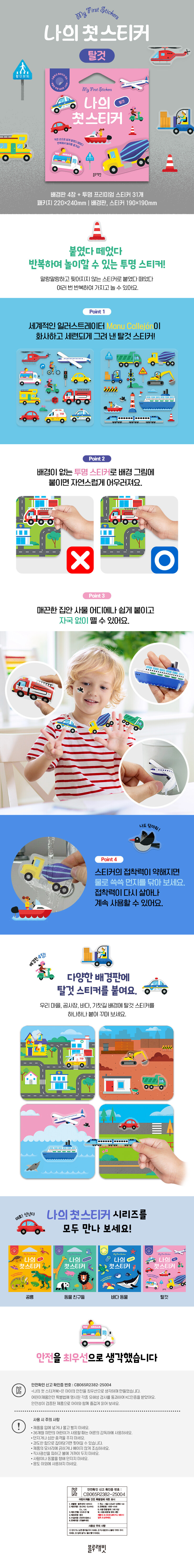 말랑말랑하고 찢어지지 않는 투명 실리콘 스티커로 붙였다 떼었다 여러 번 반복하여 놀이할 수 있는 스티커북이다. 한 번 쓰고 버리는 얄팍한 종이 스티커가 아닌 실리콘 스티커로 만들어 반복 사용이 가능하며, 배경이 없는 투명 스티커라 배경 그림에 붙이면 자연스럽게 어우러진다. 접착력이 약해지면 물로 먼지를 닦아 다시 사용할 수 있고, 집안 사물 어디에나 쉽게 붙였다 떼어도 자국이 남지 않아 자유롭게 활용할 수 있다.