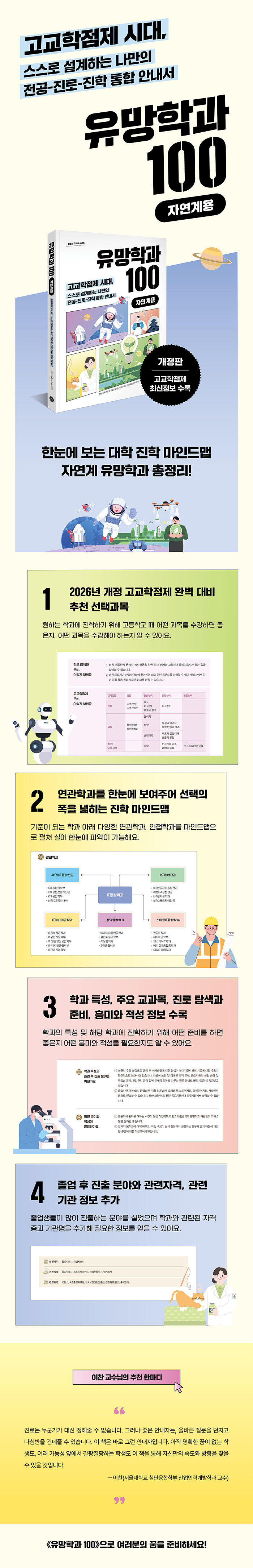 자연계 중·고등학생을 위한 가장 빠르고 가장 정확한 진로 나침반중·고등학생에게 알고 있는 자연계 학과명을 대보라고 하면 과연 몇 개나 말할 수 있을까요? 자연계에도 적성과 소질, 관심 분야에 따라 선택할 수 있는 다양한 학과가 존재하는데도 대다수 학생은 막연히 몇 가지 대표 학과만 알고 있는 경우가 많습니다. 그 누구도 자신이 알지 못하는 것을 꿈꿀 수는 없습니다. 이 책은 2026년 자연계 대표 유망학과를 8개의 분야, 100가지로 나눠 싣고 각 학과별 연관 학과까지 소개해 학생들의 꿈의 세계를 더 크고, 더 넓게 확장시켜 줍니다.