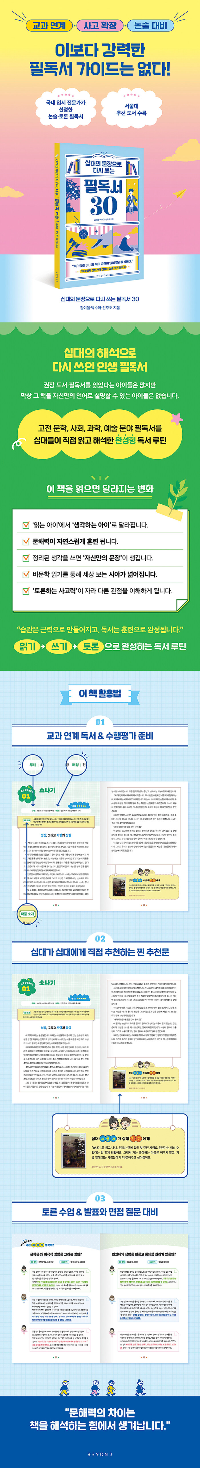 아이에게 어떤 책을 읽혀야 할지 고민하는 부모에게 《십대의 문장으로 다시 쓰는 필독서 30》은 단순한 필독서 목록이 아니라 독서 습관 형성이라는 방향성을 제시한다. 책을 많이 읽는 아이보다 책을 읽고 생각을 정리할 줄 아는 아이가 학교 수업에서도, 시험에서도 더 유리해지는 시대이기 때문이다. 이 책은 필독서를 뻔하게 설명하는 책이 아니라 필독서를 어떻게 읽어야 하는지를 보여주는 사례이며, 동시에 독서가 자기주도 독서 습관으로 자리 잡는 과정을 실제 십대의 목소리로 기록한 책이다.