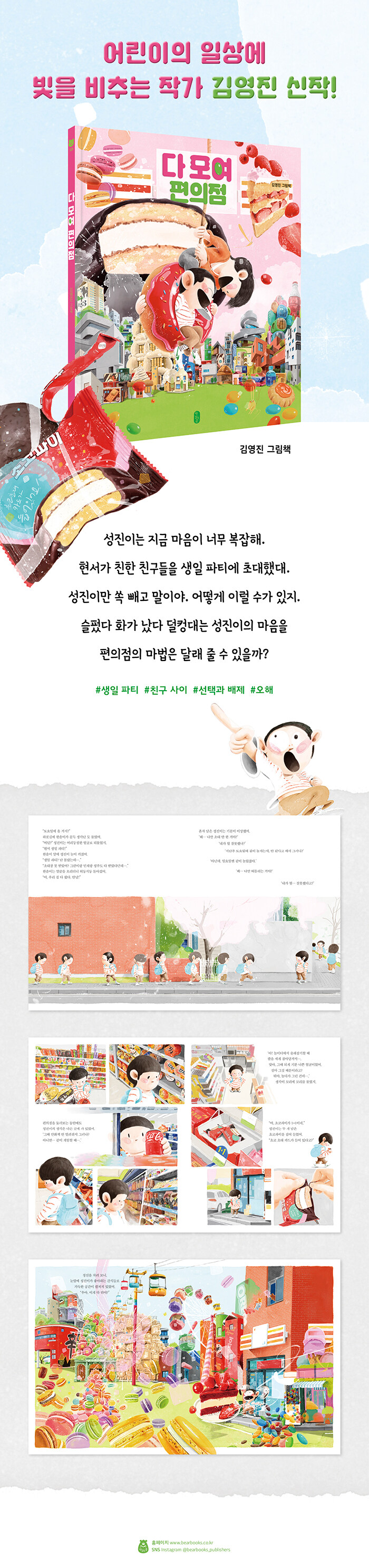 성진이는 부글부글 끓어오르는 화를 꾹꾹 눌러 참으며 편의점으로 들어갑니다. 하지만 기분을 달래러 들어간 편의점에서도 내내 현서 생각뿐입니다. 성진이는 단 걸 먹으면 기분이 좀 나아질까 싶어 1+1 하는 초코파이를 집어 들고 편의점을 나옵니다. 그런데 초코파이 봉지를 뜯는 손간 환한 빛이 성진이를 감싸더니 생각지도 못했던 곳으로 데려갑니다. 바로 성진이가 좋아하는 간식들로 이루어진 놀이동산이지요!