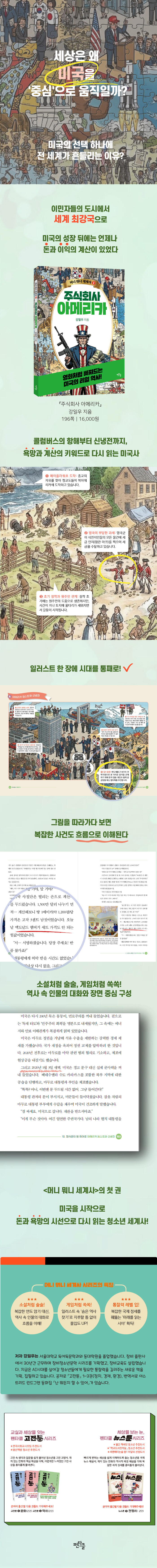 <머니 뭐니 세계사> 시리즈는 세계사를 외워야 할 정보가 아니라, 이해하고 해석해야 할 흐름으로 바꾸어 보여준다. 복잡한 연표와 개념 설명을 앞세우기보다 대화와 장면 중심 구성으로 독자를 이끌고, 청소년 독자는 그 안에서 자연스럽게 사건의 맥락과 구조를 익히게 된다. “소설처럼 술술”, “게임처럼 쏙쏙”, 그리고 읽고 나면 “통찰력 레벨 업”까지 이어지는 이유가 바로 여기에 있다. 『주식회사 아메리카』는 교과서식 설명 대신, 왜 그런 일이 벌어졌는지, 누가 무엇을 원했고 무엇을 잃었는지를 이야기로 풀어내며 미국사를 살아 움직이는 흐름으로 되살린다. 덕분에 독자는 미국의 과거를 배우는 데서 멈추지 않고, 오늘의 국제 뉴스와 세계정세를 읽는 눈까지 함께 얻게 된다.