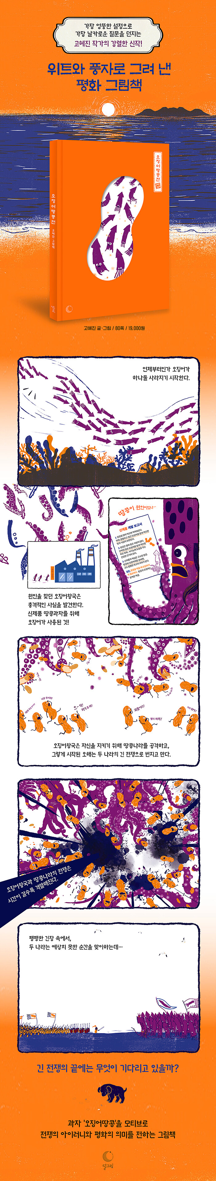 우리에게 너무나 익숙한 과자 ‘오징어땅콩’을 모티브로, 오해와 편견이 어떻게 전쟁으로 번질 수 있는지를 유머러스하면서도 날카롭게 그려 낸 그림책이다. 엉뚱하고 우스꽝스러운 오해에서 시작된 오징어와 땅콩의 갈등은 걷잡을 수 없이 커지고, 엎치락뒤치락 이어지는 전투 속에서 전쟁의 민낯이 드러난다. 마침내 전쟁의 막바지에 다다른 두 나라가 팽팽하게 대치한 순간, 예상치 못한 상황을 맞이하게 되는데…. 과연 기나긴 전쟁의 끝에는 무엇이 기다리고 있을까?