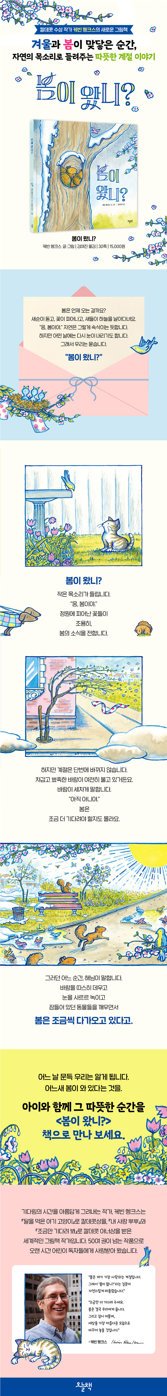 칼데콧 수상 작가 케빈 헹크스가 건네는 봄의 메시지 『달을 먹은 아기 고양이』로 칼데콧상을, 『조금만 기다려 봐』와 『내 사랑 뿌뿌』로 칼데콧 아너상을 수상한 케빈 헹크스가 신작 『봄이 왔니?』로 돌아왔습니다. 50여 권이 넘는 작품을 발표하며 오랜 시간 어린이 독자들에게 사랑 받아 온 작가는, 이번 작품에서 겨울과 봄이 맞닿은 경계의 순간을 특유의 서정적인 글과 따뜻한 색감으로 담아냈습니다.