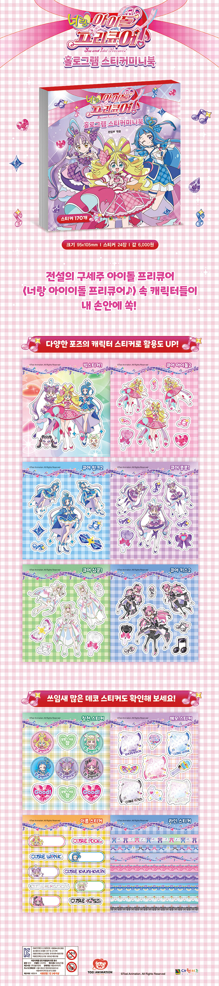 아이들에게 큰 사랑을 받고 있는 <너랑 아이돌 프리큐어♪>의 귀엽고 사랑스러운 캐릭터들이 작고 알찬 미니북 속에 가득 담겼다. 빛을 받을 때마다 반짝이는 170개의 홀로그램 스티커가 들어 있어 붙이는 순간마다 즐거움이 두 배가 된다.