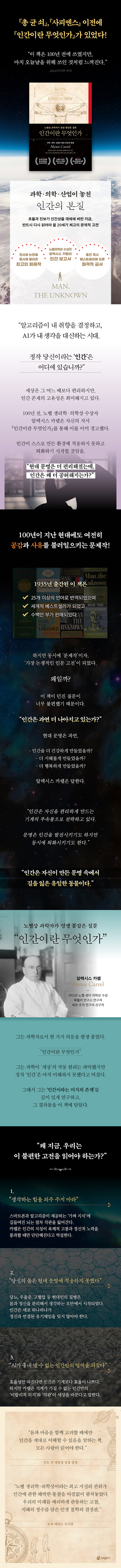 카렐은 인간을 단순한 생물학적 존재로만 보지 않는다. 그는 인간의 몸과 정신, 감정과 사회적 삶이 서로 긴밀하게 연결된 하나의 복합적 체계라는 점을 강조하며, 인간을 이해하기 위해서는 다양한 학문이 함께 작동해야 한다고 주장한다. 사상 처음으로 의학, 과학, 철학, 사회 등 여러 학문을 바탕으로 인간이라는 존재를 통합적으로 통찰한 이 책은 출간 즉시 베스트셀러에 오르며 전 세계 지성계에 파문을 일으켰다.