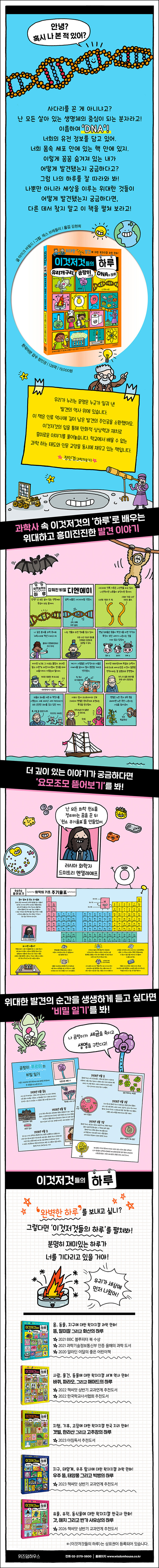 세상 곳곳 이것저것의 '하루'를 알아보는 〈이것저것들의 하루〉 시리즈의 여섯 번째 책 《이것저것들의 하루 6: 유리개구리, 곰팡이 그리고 DNA의 하루》는 '위대한 발견'에 관한 이야기를 담았다. 만화 형식으로 익살스럽게 풀어낸, 세상에서 가장 유명한 발견의 순간과 그것을 이루어 낸 과학자들의 이야기를 읽다 보면 딱딱하고 어렵게만 느껴지던 과학이 어느새 한 뼘 더 가까이 다가와 있을 것이다.