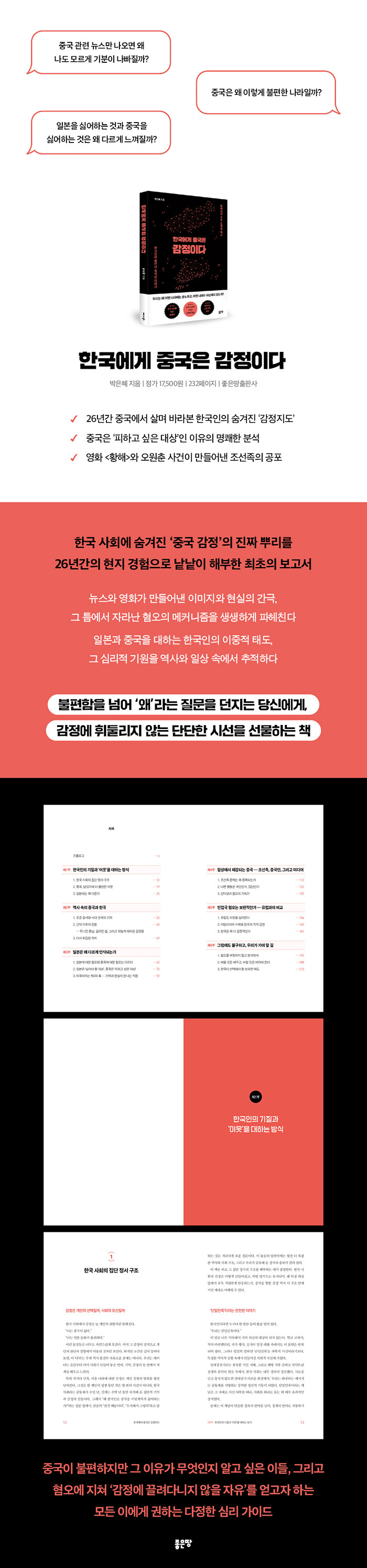 중국을 향한 한국 사회의 유독 뜨겁고도 차가운 '감정'의 실체를 인문학적 시각으로 해부한 심리 비평서다. 저자는 중국 관련 뉴스에 이유 없이 기분이 나빠지거나, 설명하기 힘든 불편함을 느끼는 현상이 개인의 문제가 아닌 한국 사회가 오랜 시간 축적해 온 감정의 역사임을 지적한다. 26년간 중국 현지에서 공부하고 일하며 마주한 수많은 장면을 통해, 우리가 왜 중국에 대한 판단 이전에 감정이 먼저 작동하는지를 세밀하게 추적한다.