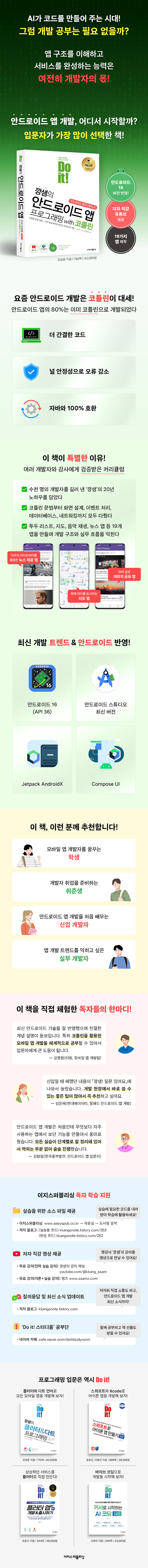 개발자이자 IT 전문 강사로 멀티캠퍼스, 삼성전자, 쿠팡, 농심데이터시스템 등 여러 교육 기관과 기업에서 강의해 왔다. 체계적인 문법과 실전 코딩을 병행하는 확실한 IT 교육 철학으로 소문난 명강사이며, 일선에서 애플리케이션 개발과 컨설팅도 하고 있다.스프링 프레임워크와 Node.js를 중심으로 모바일 앱과 자바스크립트 프레임워크 등 최근 IT 업계에 필요한 기술을 다방면으로 구사하는 실력자다. 특히 안드로이드와 아이오닉, 리액트 네이티브, 플러터 등 모바일 앱 분야에 관심을 가지고 개발과 강의를 이어 가고 있다.저서·《Do it! 깡샘의 안드로이드 앱 프로그래밍 with 코틀린 - 개정 5판》(이지스퍼블리싱, 2026)·《Do it! 깡샘의 플러터 & 다트 프로그래밍》(이지스퍼블리싱, 2023)·《깡쌤의 안드로이드 프로그래밍 with 자바》(쌤즈, 2022)온라인 강의 사이트· 주식회사 쌤즈(www.ssamz.com)