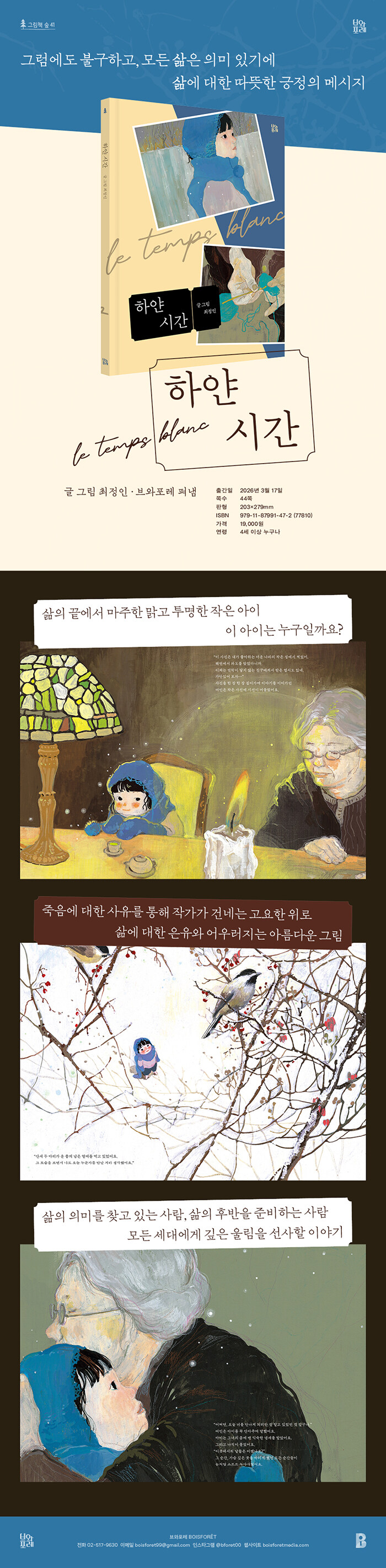 모든 세대에게 깊은 울림을 선사할 이야기최정인 작가는 여인이 아이를 만나는 시간, 삶과 죽음의 경계를 ‘하얀 시간’이라는 두 단어로 지칭합니다. 하얀 시간에 만난 아이는 삶의 마지막 순간에 다시 만나는 가장 맑고 투명했던 나에 대한 은유입니다. 과거의 나를 마주하는 시간, 하얀 시간은 삶을 다 살아낸 사람들에게 찾아오는 완벽한 ‘쉼’을 함축적으로 담고 있습니다.