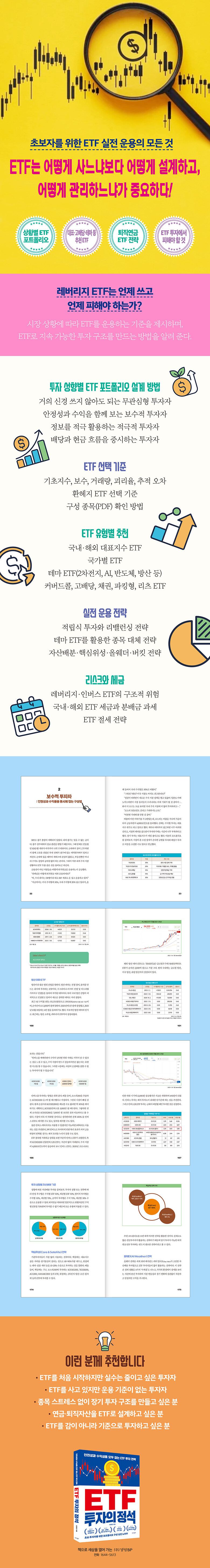 또한 ETF의 기본 구조를 이해하는 데 필수적인 요소인 기초지수, 보수, 거래량, 괴리율, 추적 오차, 환헤지 여부, 구성 종목(PDF) 확인 방법까지 정리해 투자자가 스스로 ETF를 비교·선별할 수 있도록 돕는다. 그 밖에 국내 대표지수 ETF와 해외 주요 국가 ETF, 2차전지·AI·반도체·방산·K-POP 등 테마 ETF, 커버드콜·고배당·채권·파킹형·리츠 ETF까지 폭넓게 다루며 각 ETF가 어떤 역할로 포트폴리오에 들어가야 하는지에 대해서도 설명한다.