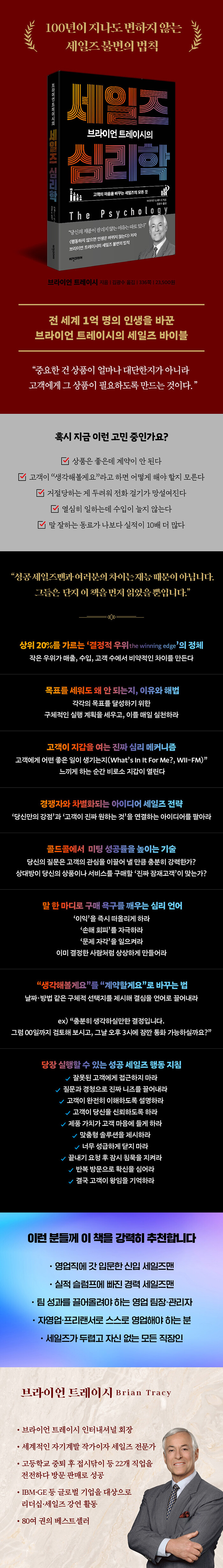 출간된 지 20여 년이 지났지만, 이 책이 여전히 전 세계 세일즈맨들의 필독서로 꼽히는 이유는 분명하다. 고객의 마음을 먼저 이해하고, 그들이 ‘필요를 느끼도록’ 만드는 세일즈불변의 법칙을 다루기 때문이다. 《브라이언 트레이시의 세일즈 심리학》은 초보자에게는 기본기를, 성과 정체에 부딪힌 숙련자에게는 돌파의 실마리를, 조직의 리더에게는 팀 성과를 이끄는 프레임을 제공하면서, 숫자 뒤에 숨은 심리를 읽는 통찰을 통해 목표 달성 확률을 높이고, 지속 가능한 성과를 만들어내는 세일즈 성공 전략을 소개한다.