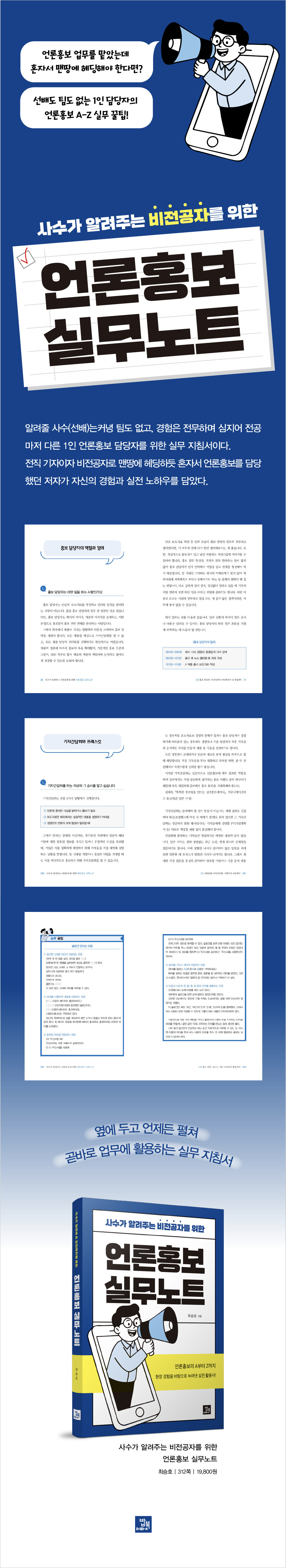 저자 역시 비전공자 출신에 전임자나 사수 없이 홀로 홍보 업무를 했다. 그런 경험의 저자는 1인 홍보 담당자가 자신과 같은 막막함과 어려움을 겪지 않도록 자신의 경험과 노하우를 아낌없이 이 책에 담아냈다.