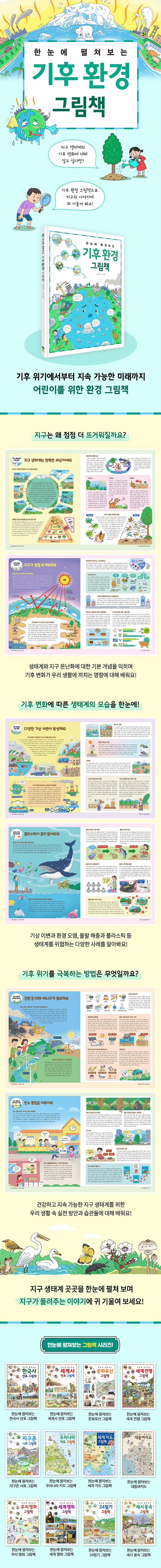 ‘기후 변화’는 초등학교 과학 교과서의 한 단원으로 배울 정도로 일상적인 이야기가 되었습니다. 《한눈에 펼쳐보는 기후 환경 그림책》은 단순히 지식을 전달하는 데 머무르지 않고, 어린이들이 기후 변화와 환경 문제에 대해 자연스럽게 공감하며 작은 실천으로 나아가도록 이끄는 출발점이 되어 줄 것입니다. 재미있는 환경 그림책으로 지구 생태계 곳곳을 한눈에 펼쳐 보며 지구가 들려주는 이야기에 귀 기울여 보세요!