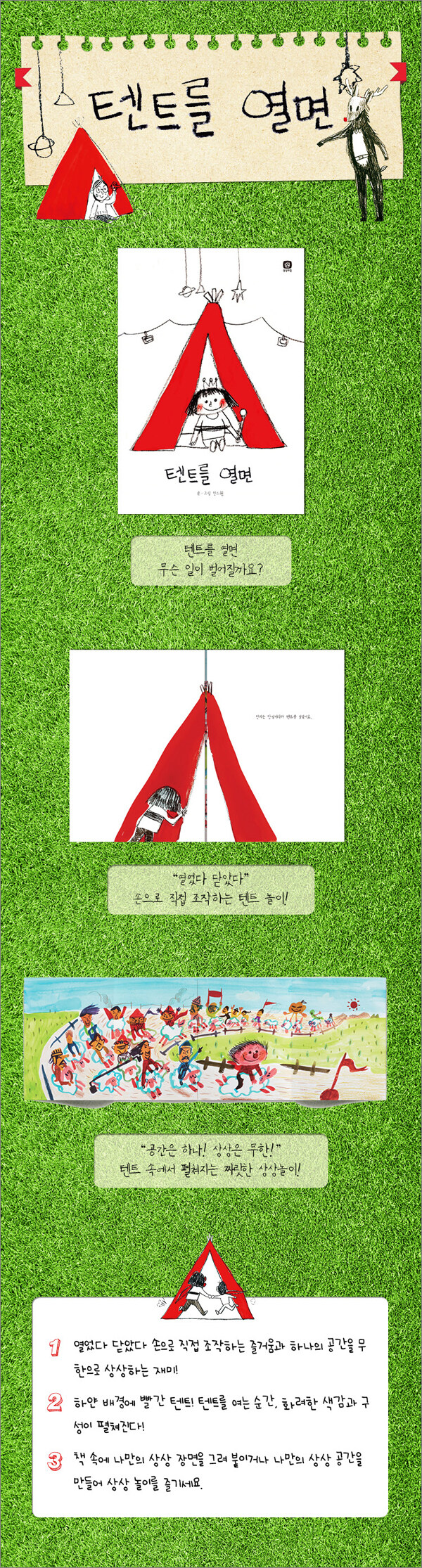공간은 하나! 상상은 무한! 열었다 닫았다 텐트 놀이를 하며 짜릿한 상상 여행을 떠나 보세요. 손으로 직접 조작하는 즐거움과 하나의 공간을 무한으로 상상하는 재미를 함께 느낄 수 있어요. 텐트를 열면 무슨 일이 벌어질지 상상하여 그림을 그려 붙이거나 친구들과 한정된 공간을 이용한 상상놀이도 책을 활용하는 좋은 방법이랍니다.