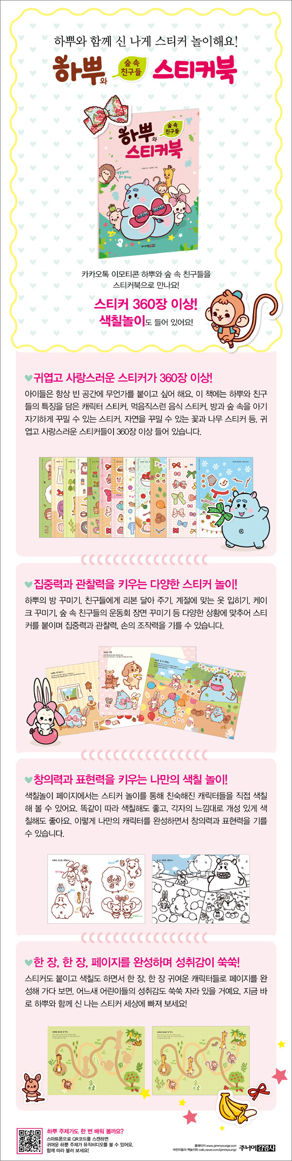 하뿌와 함께 신 나게 스티커 놀이해요!그림책 ≪하뿌의 분홍 리본 엉덩이≫에서 큰 입과 엉덩이가 콤플렉스였던 부끄럼 많은 하마 ‘하뿌’가 스티커북으로 다시 찾아왔어요. ≪하뿌와 숲 속 친구들 스티커북≫은 하뿌(하마)뿐 아니라, 리띠(토끼), 꿀돈(돼지), 양담(양), 시요, 핑요 자매(여우), 마마루, 또루, 모루 가족(캥거루), 꾸치(고슴도치), 람(다람쥐), 숭이(원숭이), 라푸(기린), 알로(코알라), 꼬꾸 아줌마(닭) 등, 까르르 숲 속 친구들이 모두 등장하는 캐릭터 스티커북입니다.