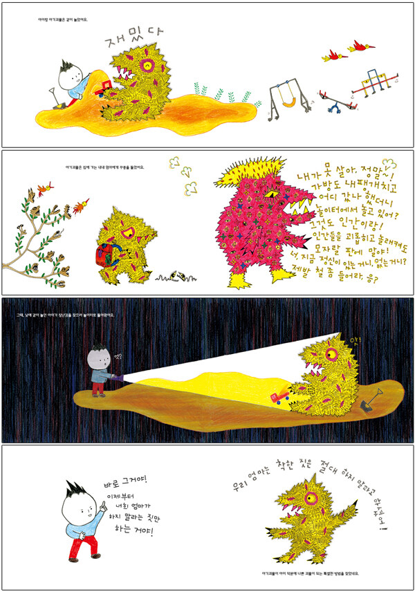 아기괴물이 요즘의 어린아이들과 닮아 있다면, 엄마괴물과 아빠괴물은 어떤가요? 아이가 길을 찾도록 기다려 주는 것, 목표를 이루기보다 그 과정을 즐겁고 행복하게 누리는 것, 아이가 싫어하는 것을 억지로 강요하지 않는 것, 이러한 것들이 아이의 행복을 위해 부모가 해야 할 일인 것 같습니다.