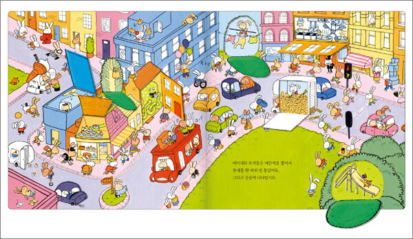 《서로 꼭 껴안아!》는 아기 토끼 데이지가 껴안아를 찾아 마을 곳곳을 뛰어다니는 동안 플랩을 요리조리 들추며 이야기를 읽어 나가는 플랩 그림책이에요. 플랩 그림책은 '다음에는 어떤 일이 일어날까?' 하는 궁금증을 불러 일으켜서 집중력을 높여 주지요. 플랩 안에 무엇이 숨어 있을지 추측해 보거나, 또 다른 상황을 상상하며 플랩을 들춰 봄으로써 더욱 큰 재미를 느낄 수 있어요. 실제로 이 책의 플랩 안에는 생각지도 못한 엉뚱하고 기발한 장면들이 숨겨져 있답니다.