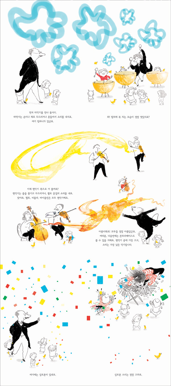 같은 타악기라도 심벌즈 소리가 세찬 파도처럼 귓가를 덮친다면, 실로폰 소리는 고운 색종이가 휘날리듯 울려 퍼진다. 묵직한 덩어리를 토해내는 튜바 소리에 깜짝 놀라고 나면, 어느새 피콜라가 실처럼 가느다란 소리로 온몸을 간질여 준다. 이처럼 알록달록한 색깔과 다채로운 질감으로 담아낸 그림은 마치 음악이 눈앞에서 살아 움직이는 것 같은 느낌을 주며 독자들의 감각을 자극한다.