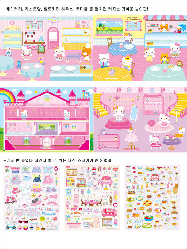 아이와 어른 모두에게 사랑받는 헬로키티를 스티커 놀이로 구성했다. 펼치면 커지는 놀이판, 놀이판을 마음껏 꾸밀 수 있는 200개의 매직 스티커가 들어있다. 놀이판의 배경은 앙증맞은 헬로키티의 하우스와 코디룸, 멋진 레스토랑과 베이커리이다. 케이크, 빵, 스테이크 등 맛있는 음식 스티커로 레스토랑과 베이커리를 꾸며 보도록 했다. 또 다양한 인테리어 스티커와 패션 스티커로 나만의 특별한 헬로키티 하우스를 완성할 수 있다.