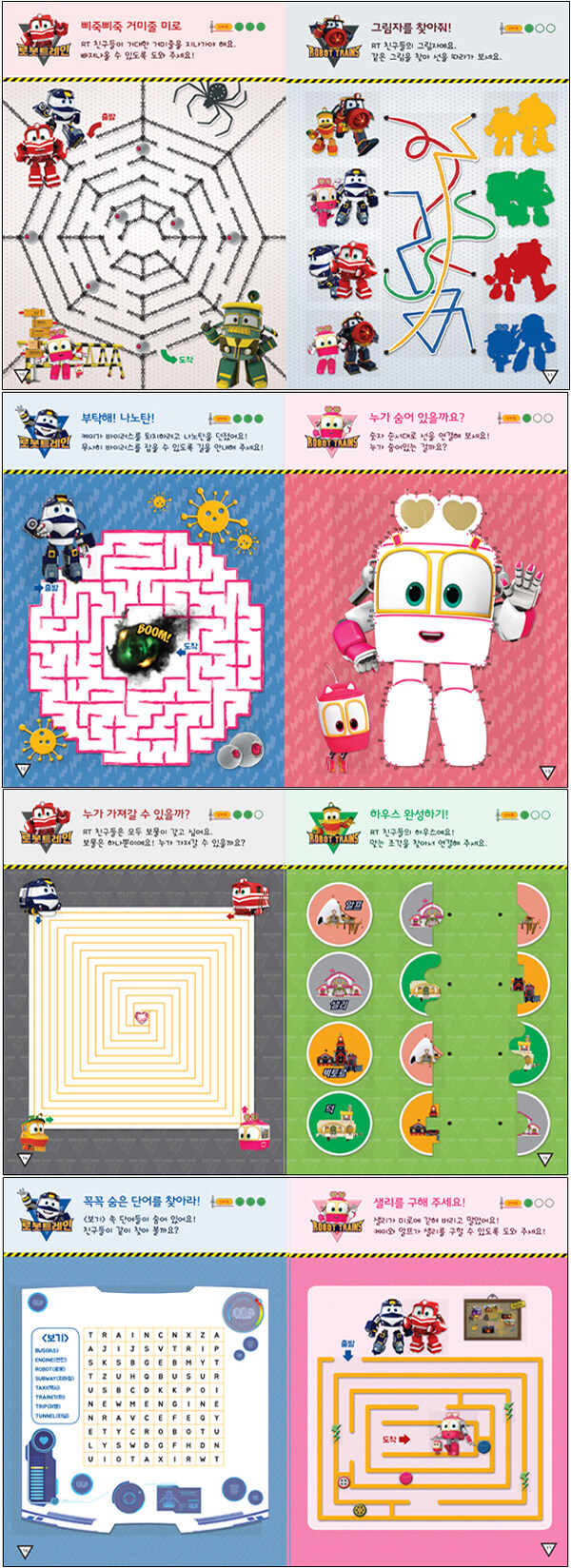 로봇트레인 친구들과 신나는 미로찾기를 시작해보세요!<썼다 지웠다 꼬불꼬불 미로미로>는 SBS-tv와 케이블 방송 투니버스에서 방영중인 인기 애니메이션 ‘로봇트레인 RT’의 캐릭터가 등장하는 재미있는 미로 놀이북입니다. 책에 들어있는 매직펜으로 썼다 지웠다 하며 미로의 답을 찾아볼 수 있고, 본문 전체에 코팅이 되어 있어 아이들이 마음껏 여러 번 그려볼 수 있습니다.