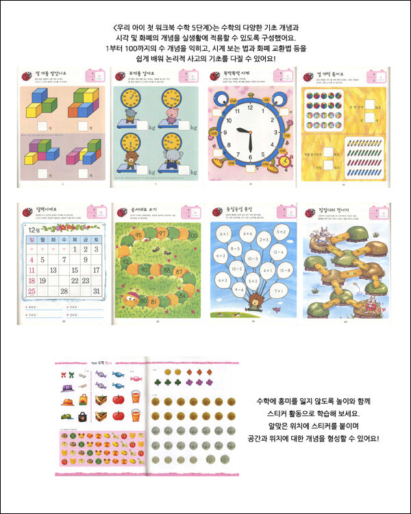 단순한 수 개념에서 벗어나 다양한 수학적 체험을 할 수 있다. 단계별 목표를 보고 알맞은 습득 단계를 선택해서 공부하고, 쉬운 단계의 문제는 아이에게 자신감을, 새로운 내용은 도전하는 힘을 길러 줄 것이다.