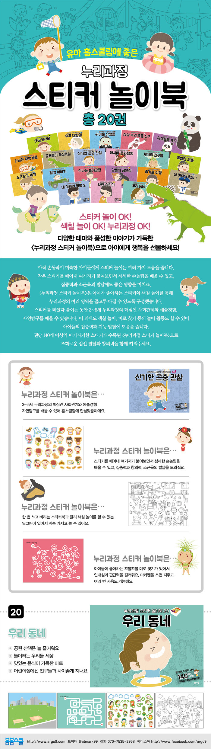 누리과정 스티커 놀이북 시리즈. 아이가 좋아하는 스티커와 색칠 놀이를 통해 누리과정의 여러 영역을 골고루 다질 수 있도록 구성했다. 스티커를 떼었다 붙이는 동안 3~5세 누리과정의 핵심인 사회관계와 예술경험, 자연탐구를 배울 수 있다. 이 외에도 색칠 놀이, 미로 찾기 등의 놀이 활동도 할 수 있어 아이들의 집중력과 지능 발달에 도움을 준다.