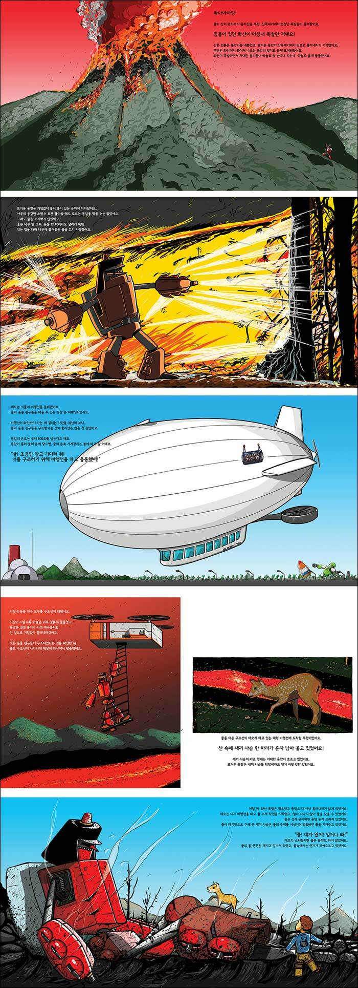 <화산이 폭발했다!>는 <로봇박사 테오>에 등장한 소방수 로봇이 주인공으로 등장하는, 시리즈의 네번째 책입니다. 평화로웠던 오후, 소방수 로봇 쿨이 시커먼 연기를 내뿜으며 폭발하는 화산에 달려가는 것으로 시작하는 이 책은, 보는 내내 아이들이 좋아하는 대형 로봇의 박진감과 함께 화산에서의 긴박감을 느낄 수 있도록 해 줍니다. 푸르른 산과 숲에 대조적인 시뻘건 용암과 화염의 묘사는 책을 읽는 동안 마치 화산의 뜨거움이 전해질 것만 같습니다.