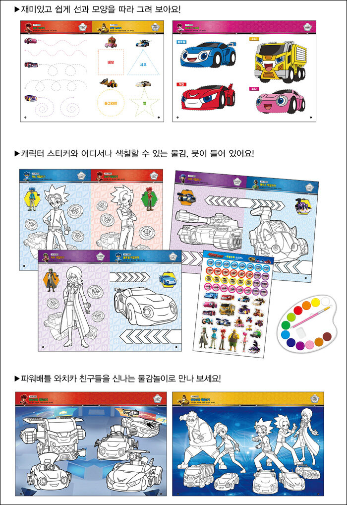 빨강, 주황, 노랑, 초록, 파랑, 보라 등 다채로운 색의 수채 물감과 붓이 함께 들어 있어 언제 어디서든지 간편하게 색칠놀이를 할 수 있다. 애니메이션 캐릭터를 알록달록 색칠하며 색 감각을 익힌다. 따라 그리기, 같은 색 찾기, 상상하며 색칠하기, 자유롭게 그리기 등 단계별로 밑그림에 어울리는 색을 골라 자유롭게 색칠하며 표현력과 창의력을 키워 준다.