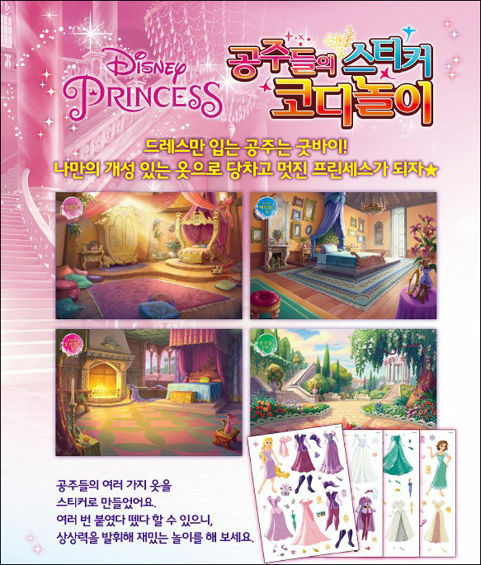 공주들의 여러 가지 옷과 소품 등 다양한 코디 아이템을 스티커로 만들었다. 또한, 각각의 공주들에게 잘 어울리도록, 개성만점 스타일로 꾸밀 수 있도록 구성하였으며, 스티커는 여러 번 붙였다 뗐다 할 수 있으니, 상상력을 발휘해서 재밌는 놀이를 해 보자.