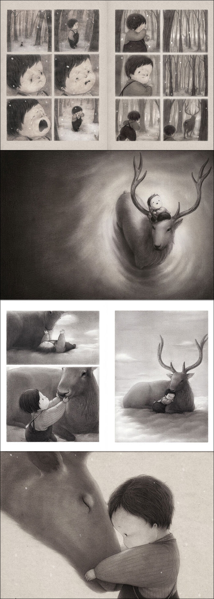 환상과 포근함으로 외로운 아이의 마음을 위로한다!오늘도 아이의 엄마 아빠는 직장에 갑니다. 늘 그렇듯 혼자 남겨진 아이는 텔레비전을 보고, 엄마놀이를 하다가 장난감도 가지고 놉니다. 혼자 노는 것이 익숙해질 만도 하지만 여전히 외롭고 심심합니다. 그러다 발견한 가족 앨범 속 사진에서 할머니와 행복했던 자신의 모습을 보게 됩니다. 아이는 옷을 입고, 머리도 단정히 한 다음 용돈 가방을 챙겨 할머니 댁으로 가기 위해 집을 나섭니다. 버스에서 깜빡 잠이 들었고 눈을 떠 보니 처음 보는 낯선 동네였습니다. 길을 잃고 엉엉 울고 있는 아이 곁에 신비한 사슴이 나타나고, 둘은 함께 숲 속 깊이 들어갑니다. 마치 토끼 구멍으로 들어간 이상한 나라의 앨리스처럼 말이지요. 그렇게 아이는 혼자가 아닌 특별한 하루를 보내게 됩니다. 사슴과 함께 떠난 여행에서 신비한 동물 친구들을 만나고, 구름 위를 마음껏 뛰어놀며 즐거운 시간을 보냈습니다. 하지만 집에서 너무나 멀리 떨어진 곳이었고 엄마도 보고 싶었지요. 사슴은 아이의 이런 마음을 알고 있을까요? 아이는 다시 가족에게 무사히 돌아갈 수 있을까요? 지은이는 글 없이 그림으로만 한 아이의 외로움, 기다림, 기대, 사랑, 기쁨을 모두 아우르는 뛰어난 구성과 연출로 한 편의 아름다운 그림책을 탄생시켰습니다. 혼자 견뎌야 하는 외로운 시간을 누군가와 함께 하고 싶다는 간절함이 극대화된 이 아름다운 그림책은 독자들의 마음을 따스하고 조용하게 위로해 줍니다.