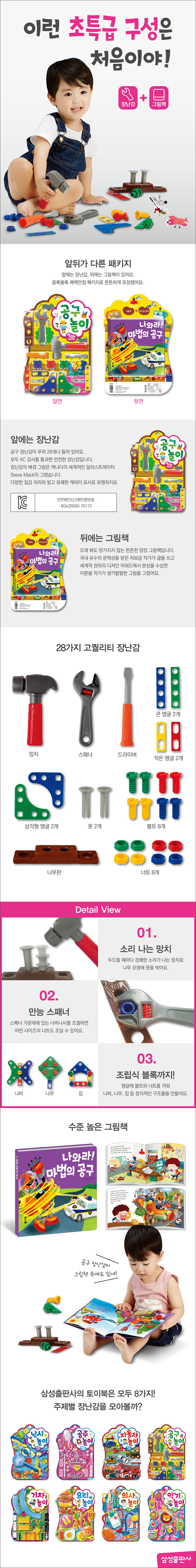 3. 세상에서 가장 재미있는 공구놀이! 망치로 못을 박고, 드라이버로 나사를 돌려 보세요. 무려 28가지 공구 장난감이 들어 있어요. 신나게 논 후에는 그림책 <나와라! 마법의 공구>를 읽어 보세요. 마법의 공구로 최고의 악당 노노피스를 무찌르는 스펙타클한 이야기입니다.