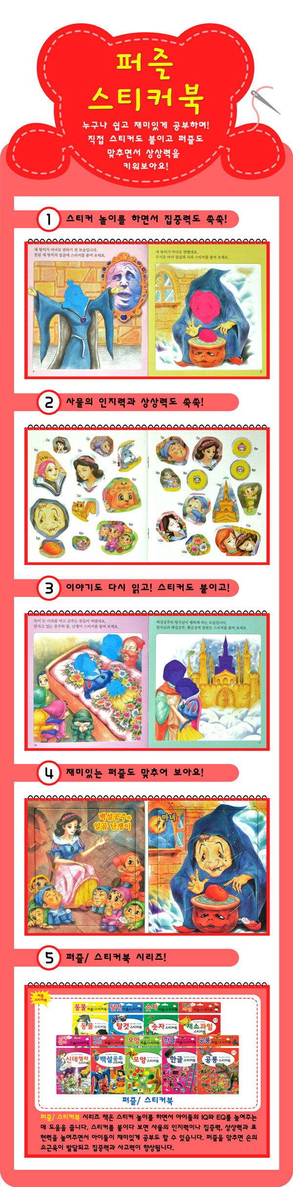 퍼즐/스티커북 시리즈 책은 스티커 놀이를 하면서 아이들의 IQ와 EQ를 높여주는데 도움을 줍니다. 스티커를 붙이다 보면 사물의 인지력이나 집중력, 상상력과 표현력을 높여 주면서 아이들이 재미있게 공부도 할 수 있습니다. 퍼즐을 맞추면 손의 소근육이 발달되고 집중력과 사고력이 향상됩니다.