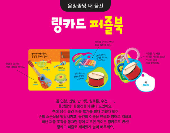 곰 인형, 신발, 밥그릇, 실로폰, 수건……. 올망졸망 내 물건들이 한데 모였어요. 책에 담긴 물건 퍼즐 10개를 뺐다 끼웠다 하며 손의 소근육을 발달시키고, 물건의 이름을 한글과 영어로 익힐 수 있답니다. 빼낸 퍼즐 조각을 동그란 링에 끼우면 귀여운 링카드로 변신! 링카드 퍼즐로 재미있게 놀며 배워 보세요.