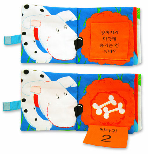 강아지가 마당에 뭔가 숨기고 있대요. 뭐야? 하고 물어보세요. 고양이는 누구랑 놀고 있을까, 누구야? 하고 물어보세요. 헝겊을 젖히고 무엇이 나오는지 몇 개가 나오는지 알아보아요! 얼룩 강아지, 줄무늬 고양이, 파란 앵무새, 빨간 금붕어, 하얀 토끼. 아이들에게 친숙한 다섯 가지 동물들을 만나 보세요.
