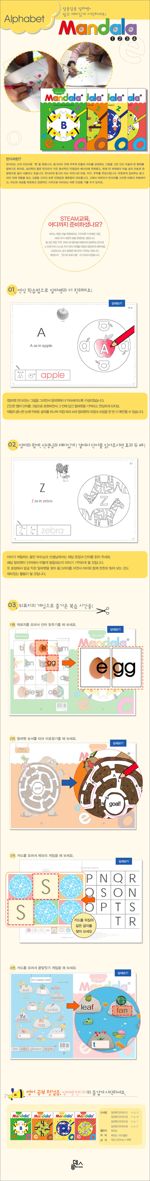 영어 공부 첫 걸음, 어떻게 시작할까요?영어를 틀어주면 귀부터 막는 아이들에게 색연필을 먼저 쥐어 주세요. 아이들이 좋아하는 채색 활동을 통해 알파벳과 더 친해지게 해 주세요. 처음 보는 글자들이 낯선 아이들에게 친숙한 동물과 사물부터 그리게 해 주세요. 영어에 막 관심을 갖기 시작한 아이들에게도 더할 나위 없이 좋습니다. 쉽고 재밌게 다가와 영어의 눈을 뜨게 하는 알파벳 만다라와 함께!