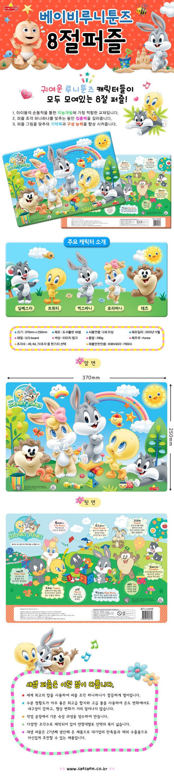 베이비루니툰즈 8절 퍼즐은 귀엽고 아기자기한 캐릭터가 모여 장난치는 장면을 담았습니다. 뒷면에는 만화 베이비루니툰즈에 나오는 등장인물의 캐릭터와 그 옆에 캐릭터에 대한 설명이 있습니다.