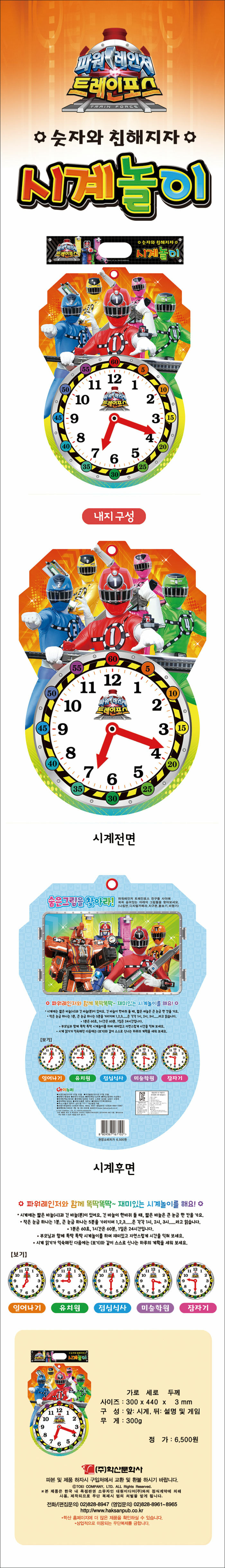 아이들이 좋아하는 캐릭터이미지가 있어 시간에 대한 개념을 재미있게 학습할 수 있는 시계놀이다. 앞면엔 시계놀이가, 뒷면엔 캐릭터 미니게임이 있어 학습도 하고 게임도 함께 즐길 수 있는 다양한 활동으로 지루할 틈이 없다. 시계놀이는 시간의 개념을 배워 아이가 스스로 시간을 잘 지키는 바른 생활을 할 수 있도록 도움을 준다.