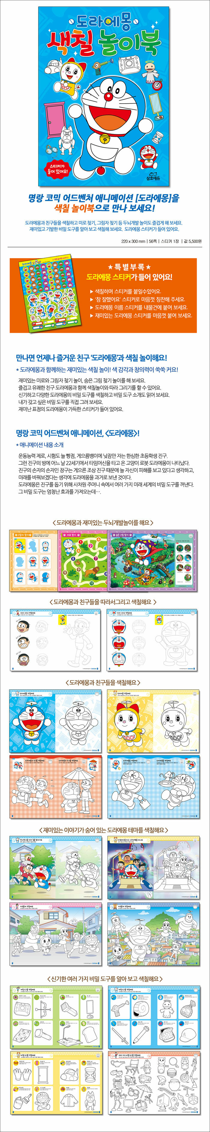 재미있는 미로와 그림자 찾기 놀이, 숨은 그림 찾기 놀이를 구성했다. 즐겁고 유쾌한 친구 도라에몽과 함께 재미있게 놀이할 수 있다. 색칠놀이와 함께 따라 그리기도 연습할 수 있다. 또한, 신기하고 다양한 도라에몽의 비밀 도구를 소개한다. 색칠도 하고 비밀 도구 소개도 읽어 보고, 내가 갖고 싶은 비밀 도구를 직접 그려 볼 수도 있다. 재미난 표정의 도라에몽이 가득한 스티커가 들어 있다.