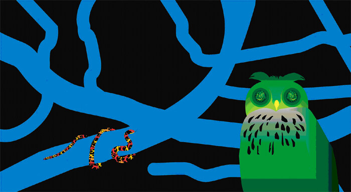 서로 뒤엉켜 있는 사람들은 나무에 매달린 잎사귀가 되었다가 나뭇가지에서 하나 둘 떨어져 나옵니다. 걷고, 뛰어오르고, 팔을 휘두르며, 마치 춤추는 듯 줄지어 움직이는 사람들은 서서히 벌레인지 뱀인지 알 수 없는 동물로 변화합니다. 마침내 독자들은 다시 제일 처음 보았던 올빼미를 만나게 됩니다.