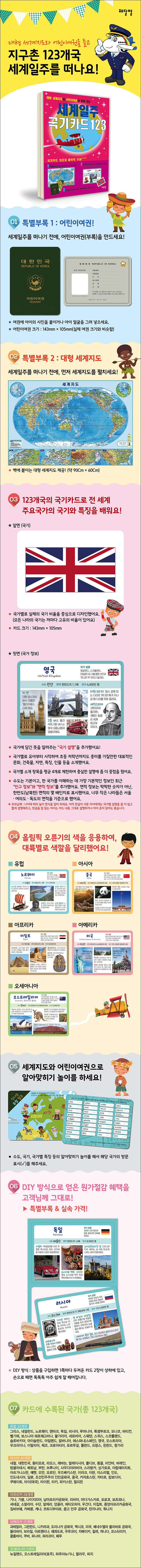 특별부록으로 제공되는 “벽에 붙이는 대형 세계지도”와 “어린이여권”을 가지고, 전 세계 123개국의 국기와 나라별 유익한 정보를 놀면서 배우는 국기카드이다. 특히 123개의 개별 국가 하나하나의 국기의 뜻을 설명하는 “국기 설명”을 추가했고, 나라 이름은 알지만 그 나라가 어디에 있는지 모르는 반쪽 공부를 벗어나기 위해 대형 세계지도를 제공하여 벽에 붙여 활용할 수 있게 했다.