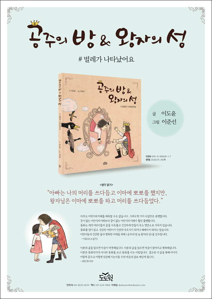 [공주의 방 & 왕자의 성]은 예쁜 꿈을 꾸는 아이들을 생각하며 만든 판타지 그림책입니다. 공주의 방에서 왕자의 성으로 가는 여행을 통해 우리 아이들이 가족의 사랑을 얼마나 원하는지 알게 됩니다. 사랑을 받고 있다고 느낄 때 숨길 수 있는 아이들은 많지 않습니다. 첫 이야기 '#벌레가 나타났어요'는 처음부터 끝까지 첫째 아이의 입으로 들려주고 있습니다. 이야기를 듣고 아이에게 한 걸음 다가가 공감해주세요. 우리 아이들은 끊임없이 행동과 소리로 마음을 표현하고 있습니다. 자녀들이 엄마, 아빠와 함께 떠나는 즐거운 여행을 위해 [공주의 방 & 왕자의 성] 문을 활짝 열겠습니다.
