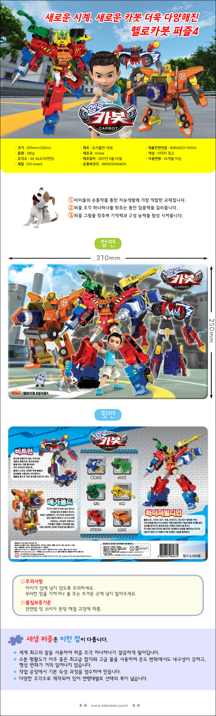 카봇 친구들을 8절퍼즐을 통해서 만나본다. 퍼즐 조각 하나하나를 맞추는 동안 집중력을 키워줄 수 있다. 퍼즐 그림을 맞추며 기억력과 구성 능력을 향상 시켜준다. 뒷면에는 앞면에 등장하는 로봇들의 설명이 기재되어 있다.