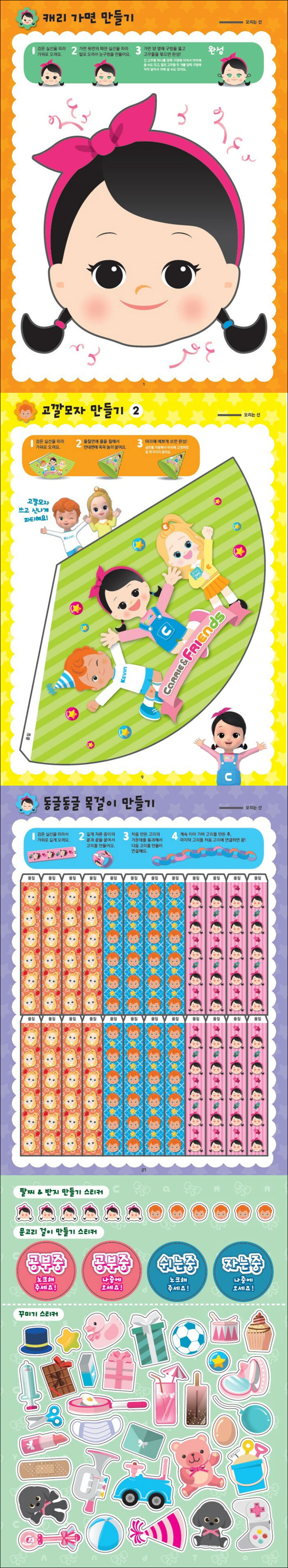 예쁘장한 외모와 다르게 엉뚱발랄한 면도 있고, 승부욕이 강해서 지기 싫어하는 왈가닥 소녀, 캐리. 캐리는 '캐리와 장난감 친구들'이라는 장난감 가게를 운영하는 부모님 덕분에 항상 새로운 장난감을 가장 먼저 만나볼 수 있다. 캐리는 언젠가는 캐리만의 멋진 장난감을 만들어서 친구 캐빈, 앨리에게 선물하는 게 꿈이다. 이 책은 아이의 오감을 자극하는 재미있는 만들기 놀이북이다.