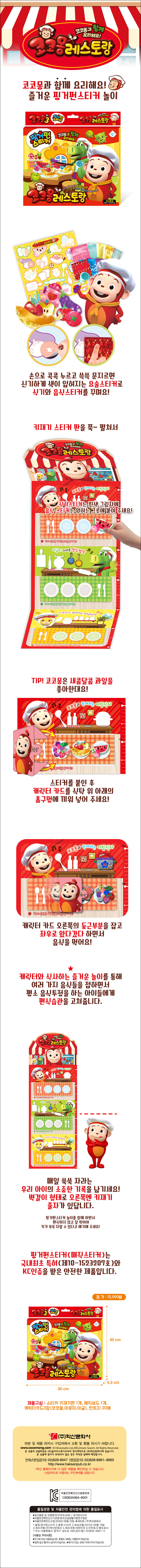 스티커판 오른쪽에는 키재기 줄자가 있어 벽걸이 용으로 붙여서 매일 쑥쑥 자라는 우리 아이의 키를 확인할 수 있다. 아이들이 가위나 칼 혹은 색칠재료 없이 손으로 꼭꼭 누르고 쓱쓱 문지르기만 하면 누구나 스스로 손쉽게 색칠하고 만들 수 있는 핑거펀 놀이와 키재기를 코코몽 레스토랑으로 동시에 만날 수 있다.