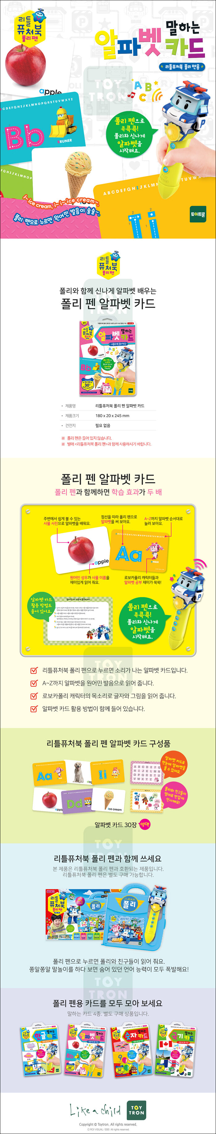 리틀퓨처북 폴리펜으로 누르면 소리가 나는 알파벳 카드이다. (폴리펜의 서브상품) A~Z까지 알파벳을 원어민 발음으로 읽어준다. 로보카폴리 캐릭터의 목소리로 글자와 그림을 읽어주며, 알파벳 카드 활용방법이 함께 들어있다.